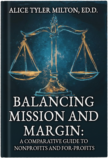 Alice Tyler Milton, Ed.D, author of “Balancing Mission and Margin: A Comparative Guide to Nonprofits and For-Profits.” She is a passionate advocate for helping organizations balance their mission with financial sustainability, particularly in the context of nonprofits and for-profit entities.